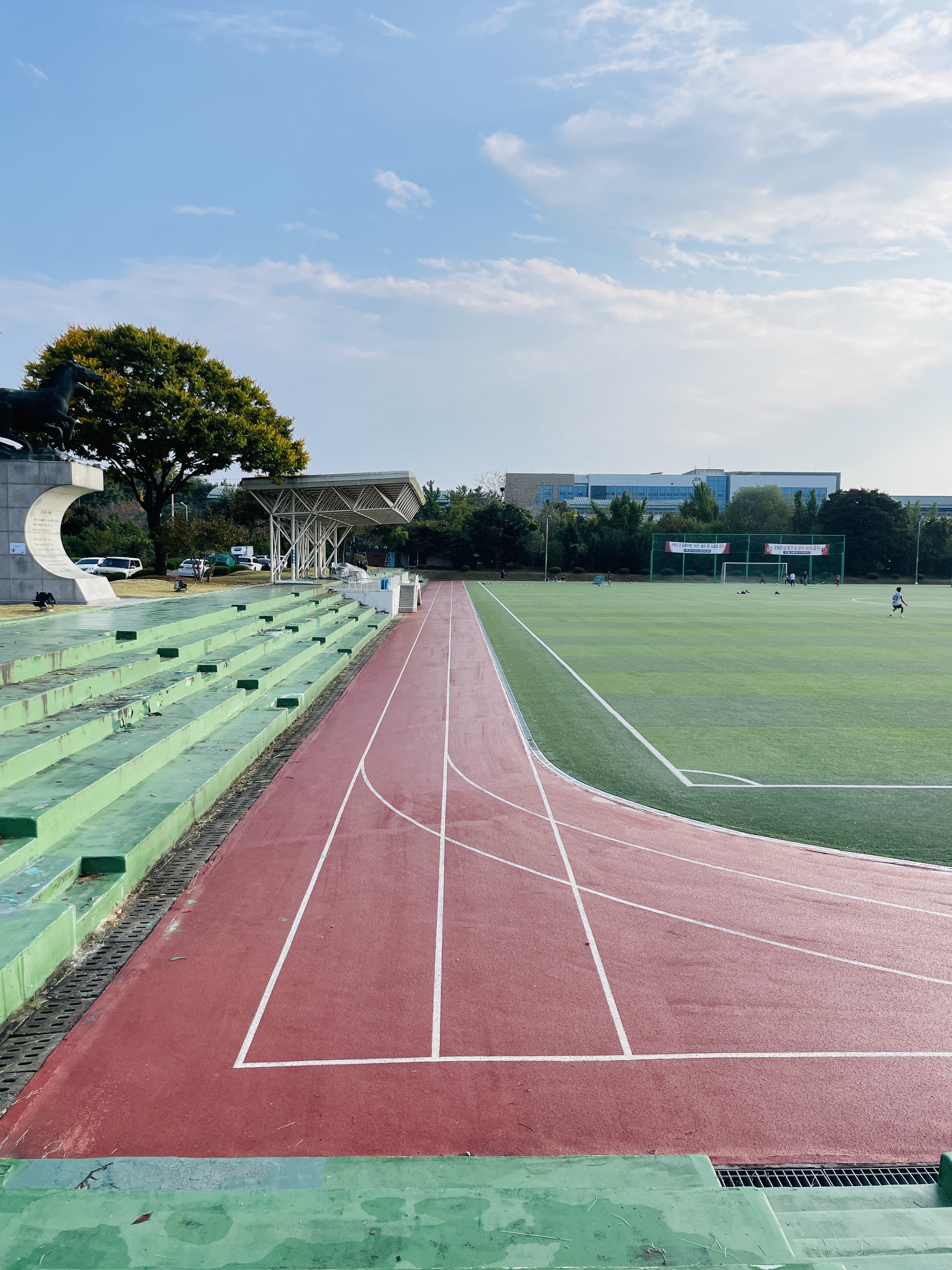 운동장 너머로 정문이 보인다