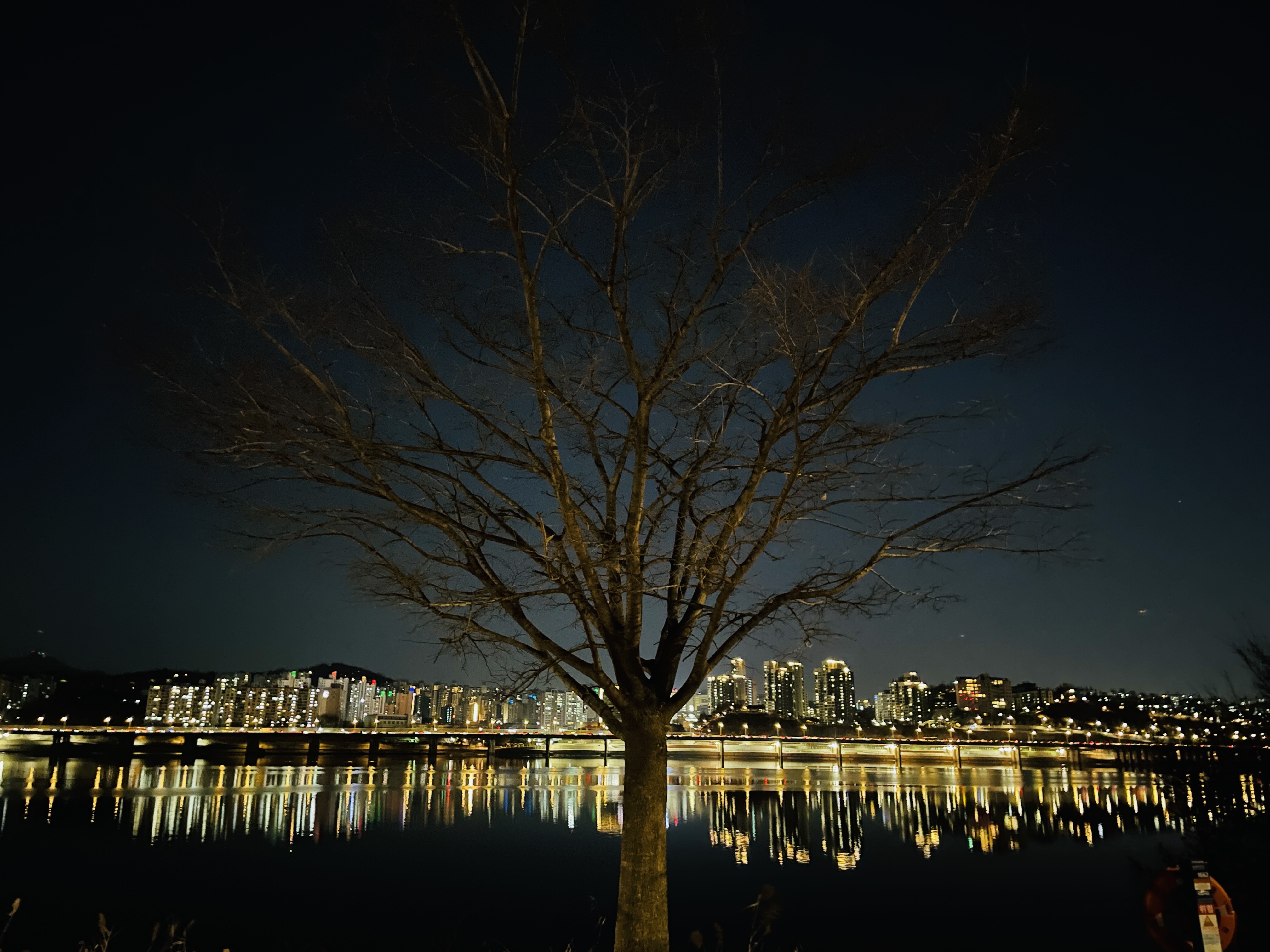 번쩍번쩍한 한강 너머 풍경과 앙상한 나무가 참으로 대조적이다