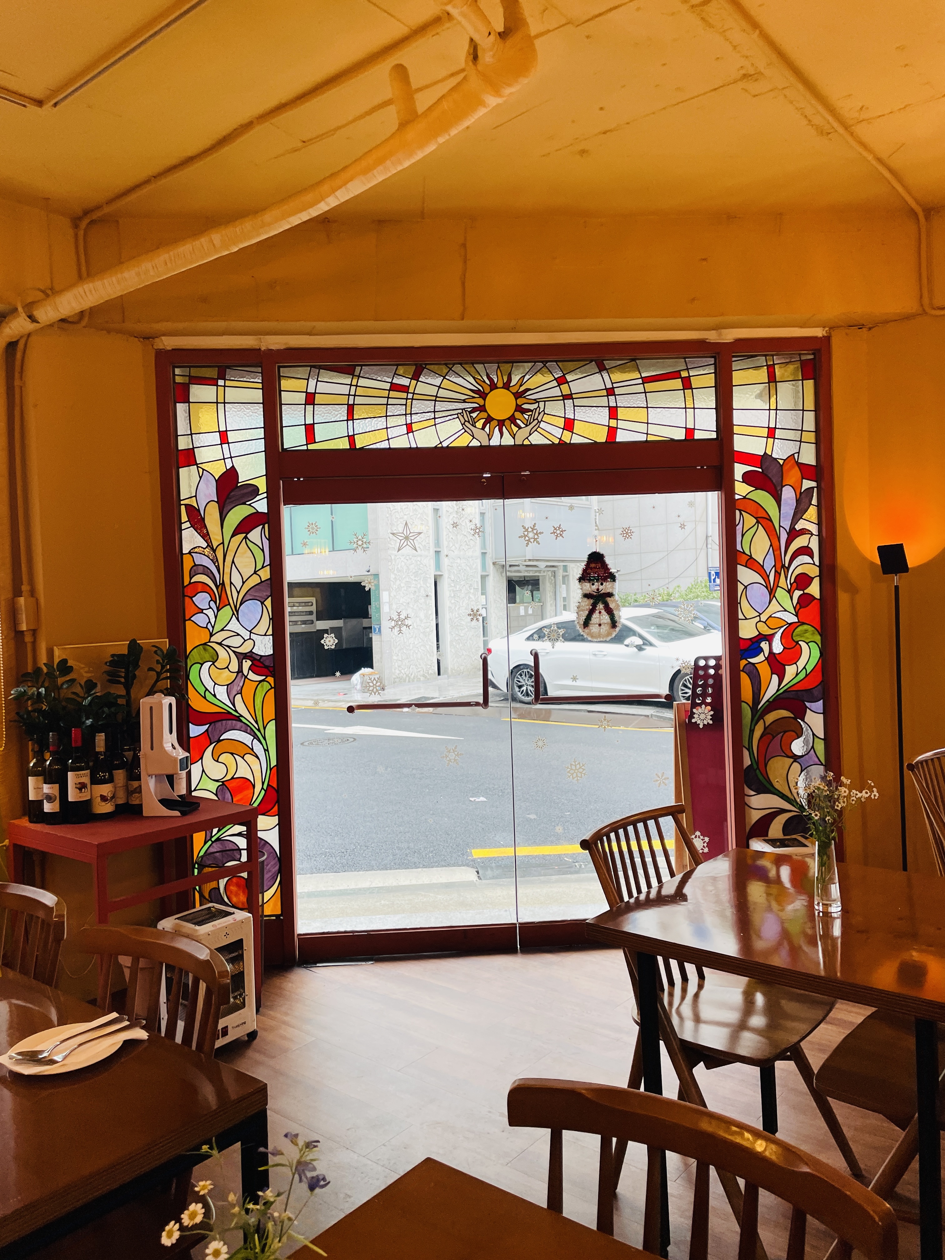 문을 둘러싼 스테인드 글라스가 인상적이다