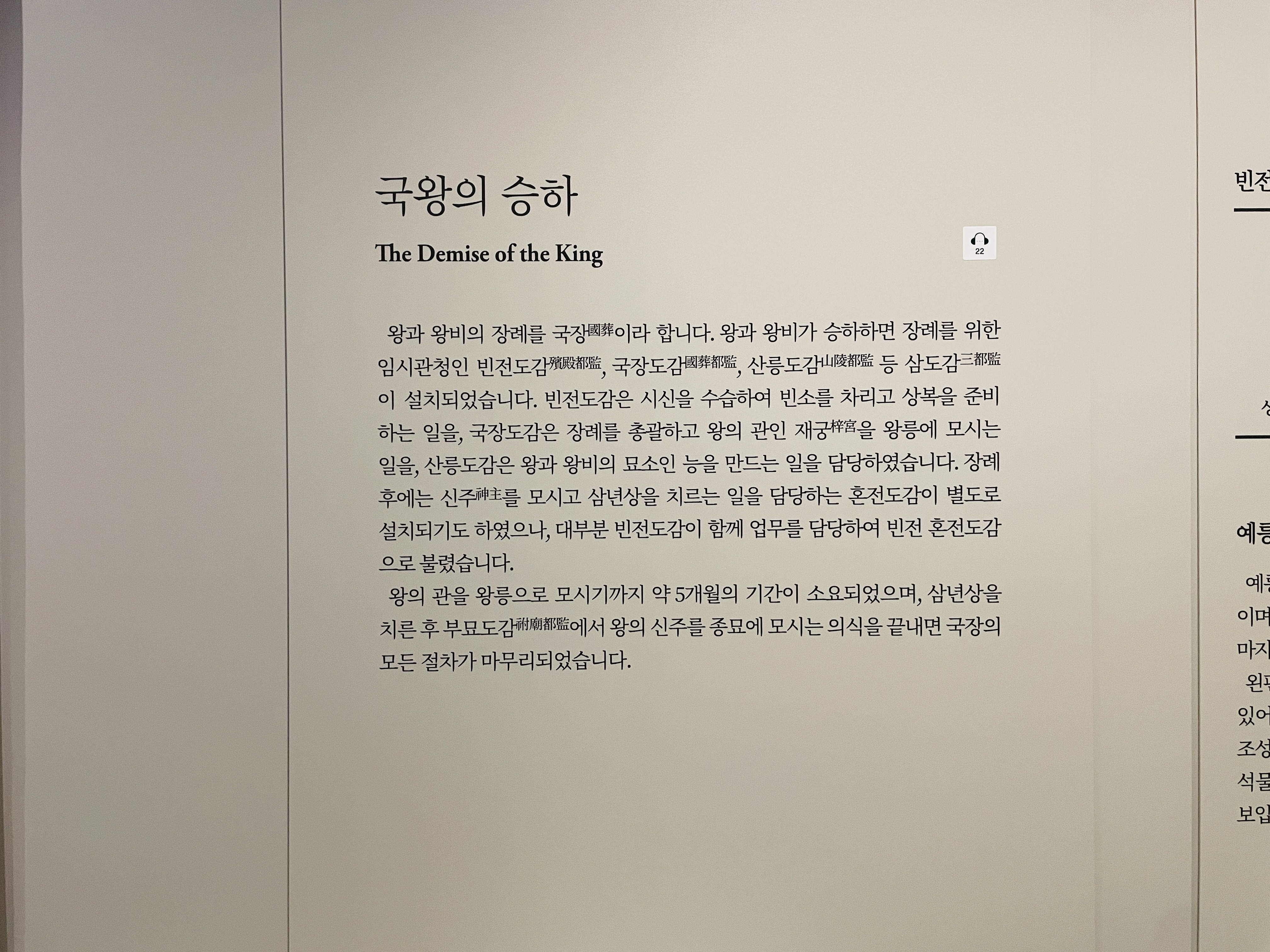 왕실의 인물이 돌아가면 시신을 수습해서 재궁이라는 관에 넣는데 발인 전까지 재궁을 빈전이라는 건물에 두게 된다