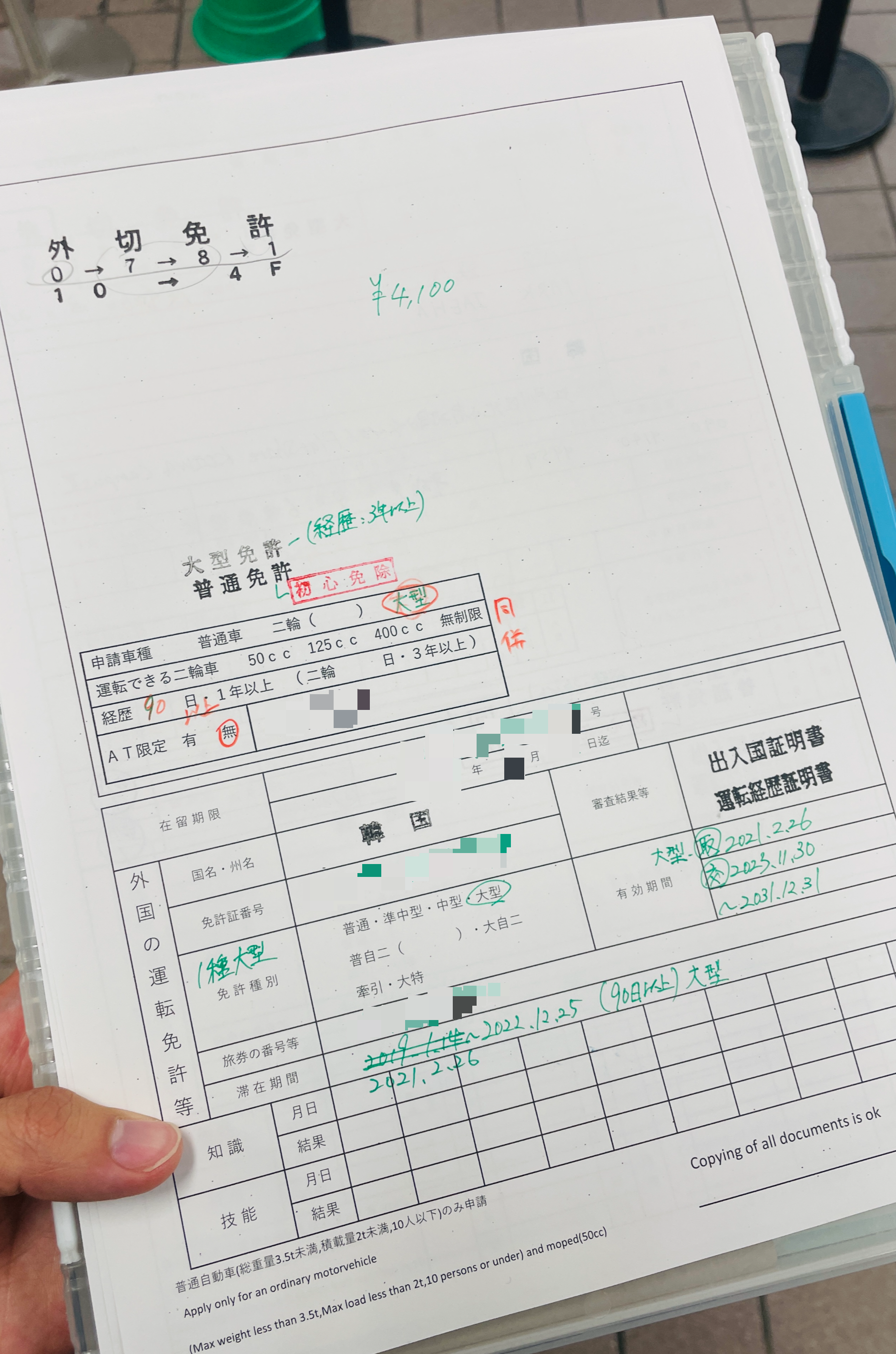 이 수수료가 4000엔 정도해서 아무리 그래도 떨어지면 안타깝다고 생각하셨는지 보통면허랑 교환수수료만 먼저 내고 대형면허 수수료는 심시력검사 합격하면 내자고 해주셨다