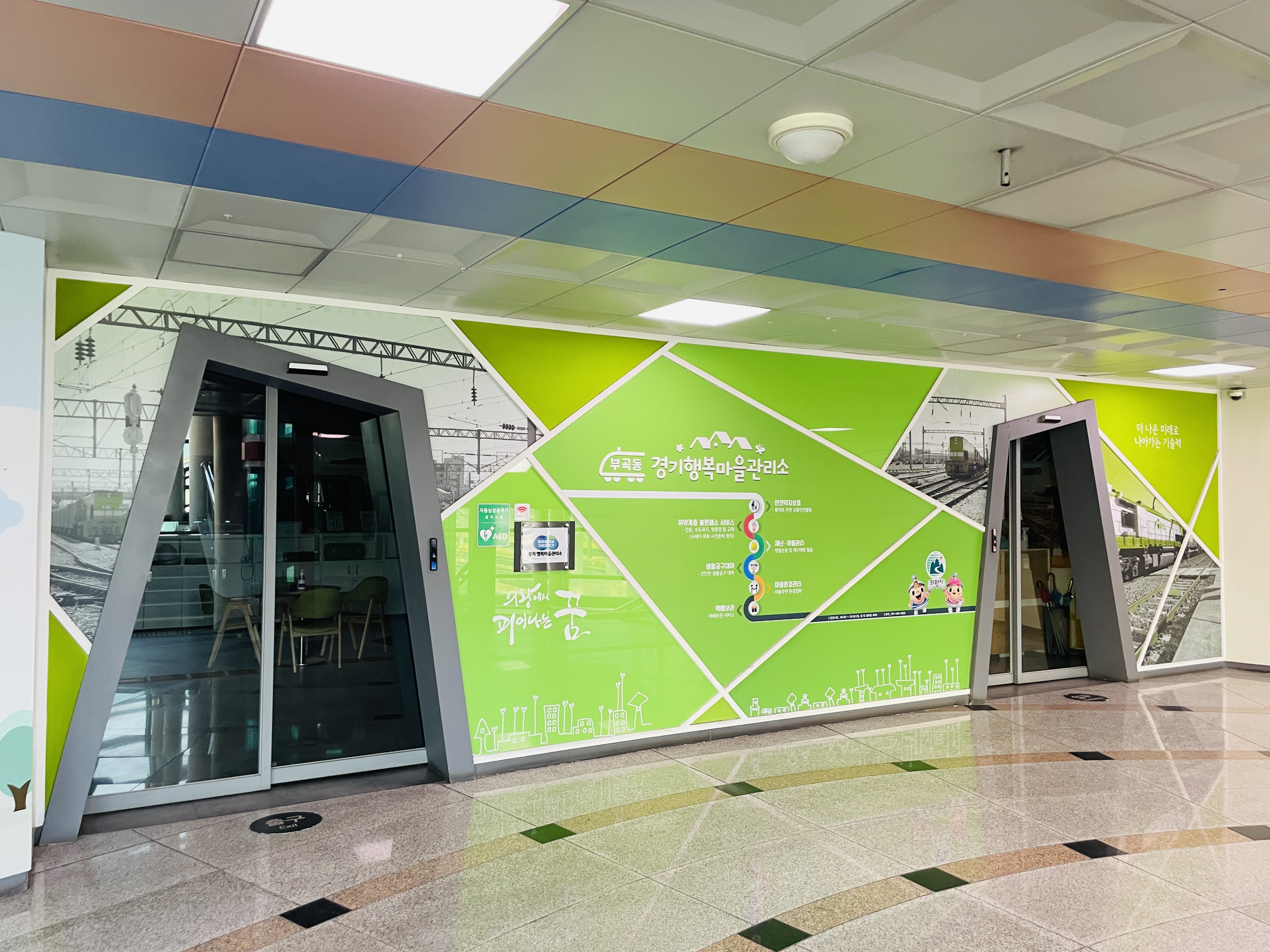 교육을 진행할 수 있는 공간이 가운데 크게 있고 쉴 수 있는 공간이 안쪽에 있다