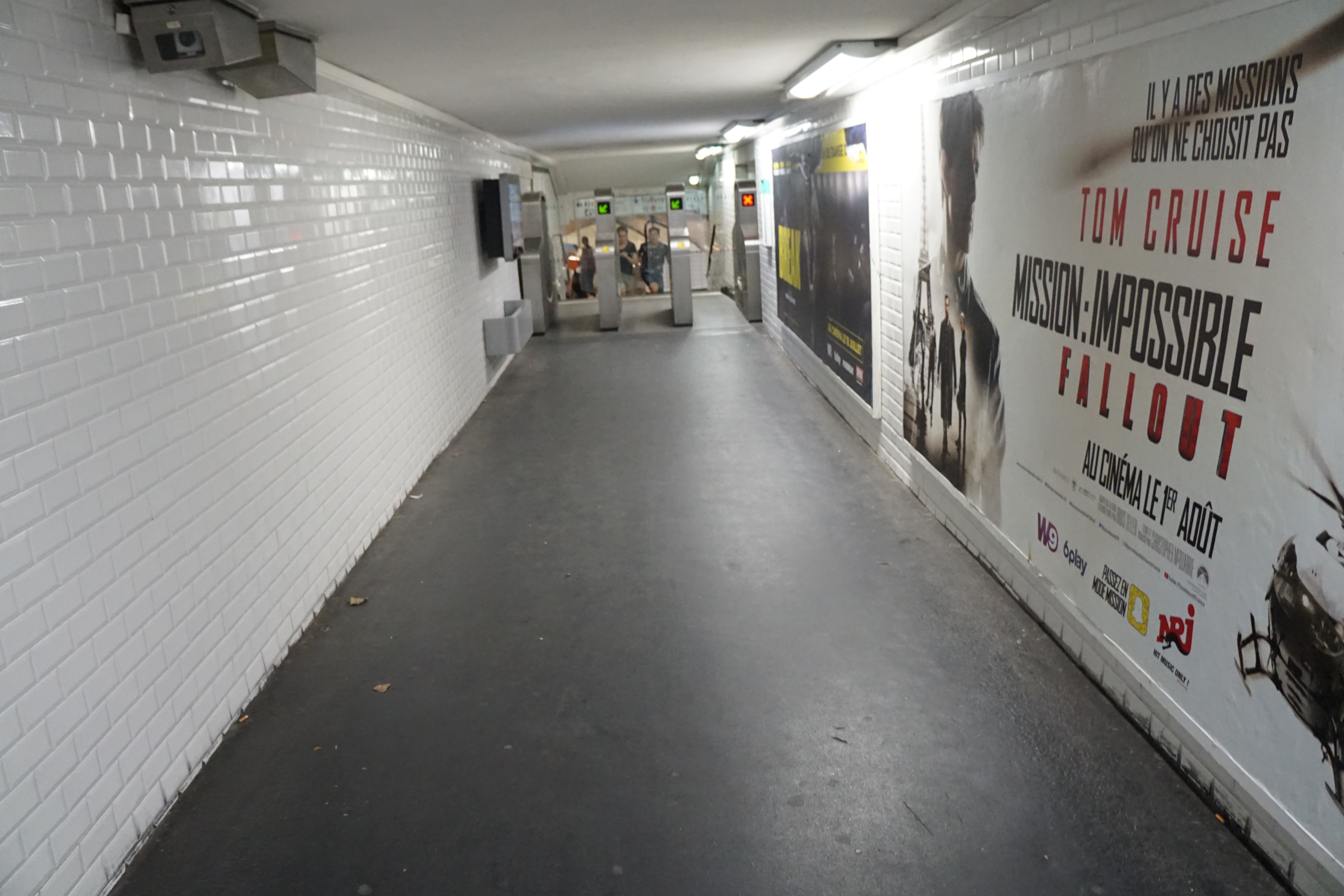 지하철 통로가 온통 하얀 타일이다